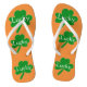 Lucky is written in white text on green shamrocks. Festive Ireland flag colours in green, white, orange for the Irish and Saint Patrick's Day or to wear anytime. Fun, unique Flip Flops perfect for summer fun, the beach and vacation travel for anyone. Shown with a white slim strap and white sole. Original Graphic Artwork by TamiraZDesigns.