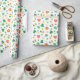 Wrapping paper for St Patrick's Day with a pattern of orange beards, leprechaun hats, gold coins, shamrocks, Irish flags, and horseshoes.