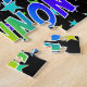 This exciting, lively, birthday-themed jigsaw puzzle design features the message "HAPPY BIRTHDAY, SHANNON" with the characters having a colourful rainbow spectrum inspired gradient pattern, along with a fun field of stars background pattern. A colourful puzzle like this might be a fun way to send birthday greetings to somebody named Shannon. [~Z0000468]