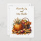This Thanksgiving postcard showcases a digital watercolor illustration of harvest apples and a ripe pumpkin. The front features the text "Share the Joy and Give Thanks," while the back includes the greeting, "Wishing you and yours a beautiful Thanksgiving. One that is full of happy memories of family, food, and love." As a template, this card allows for personalisation to suit individual holiday preferences. AI art designed by Susang6.