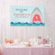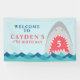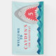 Shark bite birthday party banner with large shark mouth, turquoise waves and red text.