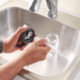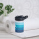 A shark illustration with a background of horizontal lines in different shades of blue covering around the bottle, on the back you can customize