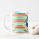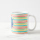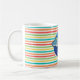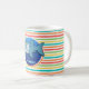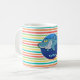 Cool, cute kids ocean, sea life, theme design with blue cartoon shark on colourful red, orange, yellow, green, blue, white rainbow stripes pattern.