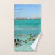 Bathroom towel set with two towels and a wash cloth with a photo of a shark chasing butterfly fish in the clear blue water of the lagoon of the tropical pacific island Bora Bora of the Tahiti archipelago French Polynesia. Above the water you can see overwater bungalows.