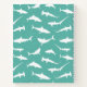 Awesome notebook printed with a graphic design of a frenzy of sharks. White sharks swimming on a blue background. The design includes Hammerheads, Tiger Sharks, Great Whites and Threshers.