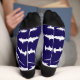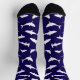 Novelty navy blue socks patterned with swimming sharks. The perfect gift for shark fans.