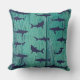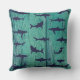 Cool cushion printed with silhouettes of a school of different sharks, on a blue weathered wood background.