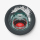 Waves crash behind the head of a lunging shark, mouth open, full of sharp teeth. Great for eating snacks during Shark Week!