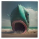 Shark sculpture on the beach, in the style of rendered in cinema4d, surrealistic grotesque, dreamlike illustration, dark cyan and green, concept art, gigantic scale, fish-eye lens