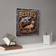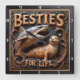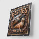 This highly dimensional square wall clock features a bold illustration of a large gray shark with an open mouth and a happy, spotted tan seal swimming together. The entire design is rendered in muted brown, gold, and dark gray tones, strongly suggesting a deep carved relief or Engraved Wood Look, resembling sculpted marine elements. The shark is positioned behind the seal, creating a playful contrast between the fearsome predator and the cheerful, smiling seal. They are framed by an elaborate wreath of swirling, dark brown vines and bubbles carved into the perimeter. The carving style gives the entire image a strong three-dimensional, sculpted quality. The large, three-dimensional embossed text "BESTIES FOR LIFE" is carved across the top and bottom in a bold, golden serif font. The clock face features a simple clock face border with large, white, numbered tick marks (1 to 12) integrated into the outer frame. The artwork is surrounded by a thick, dark brown decorative border that resembles a black wood frame.