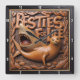 This highly dimensional square wall clock features a bold, heavily stylized illustration of a large tan shark with an open, toothy mouth and a happy, smiling brown seal swimming together. The entire design is rendered in muted brown and tan tones, strongly suggesting a deep carved relief or Engraved Wood Look, resembling aquatic wood or rock formations. The shark is positioned primarily behind the seal on the left, with its mouth open, while the seal is in the foreground looking forward with a friendly expression. They are surrounded by detailed, carved seaweed, kelp, and bubbles. The background is a dark wood panel with carved texture. The large, three-dimensional embossed text "BESTIES FOR LIFE" is carved across the top and partially down the right side in a bold, stylized font. The clock face features a simple clock face border with large, white, numbered tick marks (1 to 12) integrated into the outer frame. The artwork is surrounded by a thick, dark brown decorative border that resembles a black wood frame.