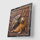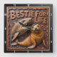 This highly dimensional square wall clock features a bold, heavily stylized illustration of a large tan shark with an open mouth and a happy, smiling brown seal resting together. The entire design is rendered in rich brown and orange leather-like tones, strongly suggesting a deeply carved texture or Engraved Wood Look, similar to sculpted leather. The shark is positioned on the left with its teeth visible, while the seal appears cheerful and relaxed on the right. The background features intricate, swirling vine and leaf patterns carved deeply into the central panel. The carving style gives the entire image a strong three-dimensional, sculpted quality. The large, three-dimensional embossed text "BESTIE FOR LIFE" is carved prominently across the top and down the right side in a bold, stylized font. The clock face features a simple clock face border with large, white, numbered tick marks (1 to 12) integrated into the outer frame. The artwork is surrounded by a thick, dark brown decorative border that resembles a black wood frame.