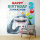 Blushing Shark wearing party hat with balloons.