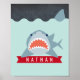 This cute nursery & kids' room art poster features a navy blue background with an open mouth shark under the light blue water and a shark fin above the water. Personalise for your needs. You can find more matching products at my store.