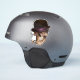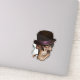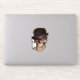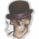 A grinning skull looks up to you in a roguish way, donned in a black derby with a purple band.
