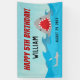 This boys birthday party banner features a shark design. The graphic is a large shark mouth and teeth accented by blue water waves. Customise this banner with the name and age of the birthday boy!