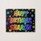 This exciting, fun, birthday-themed jigsaw puzzle design features the message "HAPPY BIRTHDAY, SHARON" with the characters having a colourful rainbow spectrum inspired gradient pattern, in addition to a vibrant star field background pattern. A vibrant puzzle like this might be a fun way to send birthday greetings to somebody named Sharon. [~Z0000468]