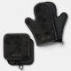 This oven mitt and potholder set features a lower stamped effect name or monogram on a mottled black background giving a look of faux suede.
