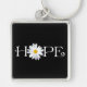 Premium square keychain with the word Hope on it with a white and yellow Shasta Daisy flower in place of the "O" in Hope, on a solid black background.