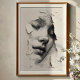 This deeply emotive black and white portrait captures a human face in a moment of profound introspection or raw vulnerability, rendered with an extraordinary etched and line art technique. The detailed lines create a textured, almost topographical map of the face, with eyes closed in a gesture of contemplation or release. What makes this piece truly unique is the surrounding "shattered" or "torn paper" effect, as if the image is breaking through a surface, adding layers of conceptual depth and visual drama. The monochrome palette accentuates the intricate detail and stark contrasts, highlighting the expressive contours and the raw emotion conveyed. This captivating artwork is perfect for those who appreciate powerful figurative art, unique illustration styles, and a piece that speaks to inner worlds.