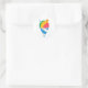 A cute shave ice with rainbow colours, a straw and a stick spoon in a blue and white stripes cone on a white round sticker. A great sticker for birthday favours or sealing invites!
