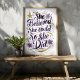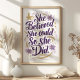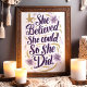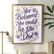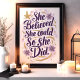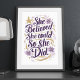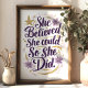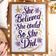 This inspirational wall art features the empowering quote, "She Believed She Could So She Did," in bold, elegant purple script accented with gold glitter details. The design is enhanced with delicate lavender flowers and golden stars, creating a beautiful and uplifting piece for any room. Perfect for adding a touch of motivation and feminine charm to your space, this print makes a thoughtful gift for anyone pursuing their dreams.