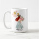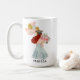 This mug design features a watercolor painting of a girl with light skin and red hair with a blue dress and a graduation cap holding balloons, flowers and her diploma rolled up. You can add a name to the front. The back design features the quote "She believed she could, so she did" in script and serif type over faux gold glitter. A graduation cap and tassel on top of the quote complete the design.