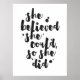 Inspirational poster displaying the phrase "She believed she could, so she did" in black brush script with an organic ink texture to achieve an authentic, hand lettered look. Designed to look great on all portrait orientated poster sizes. Please do check if the image needs to be repositioned or resized after changing the poster size.