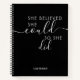 This modern design features the text "She Believed She Could So She Did" in modern grey and white typography on a black background with your personalised name below. Personalise by editing the text in the text box provided.