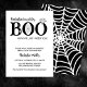 Halloween Bridal Shower Theme "She found her Boo" featuring spooky but classy invitation with diamond ring, spider web on a dark black glittered background with elegant and sophisticated typography. This products can be easily edited with your personal details.