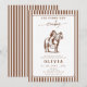 The invitation is framed by a sophisticated brown and white vertical stripe border, giving it a modern yet timeless feel. All text is fully customizable, allowing you to easily update the name, date, time, and location details for your specific event. Printed on high-quality cardstock, this invitation sets a warm and inviting tone for a beautiful celebration of love.