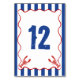 Create custom table cards with a nautical flair. These table cards feature my realistic style lobster illustrations accenting the big and bold number in blue at the center. The table number and graphics are set inside a red frame with scalloped wavy lines against a blue and white striped background. The same design is on both sides of the card. To create a set of table number cards you will have to manual add each number to a card and add it to your cart.