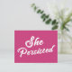 This typography postcard features the words "She Persisted" in white on hot pink, featuring a modern, rounded script font. Celebrate Elizabeth Warren and the brave, strong women who came before AND after her. Use it to drop a note to your favourite left-leaning feminist friends! Customise the background colour to your liking... if you prefer something other than hot pink!