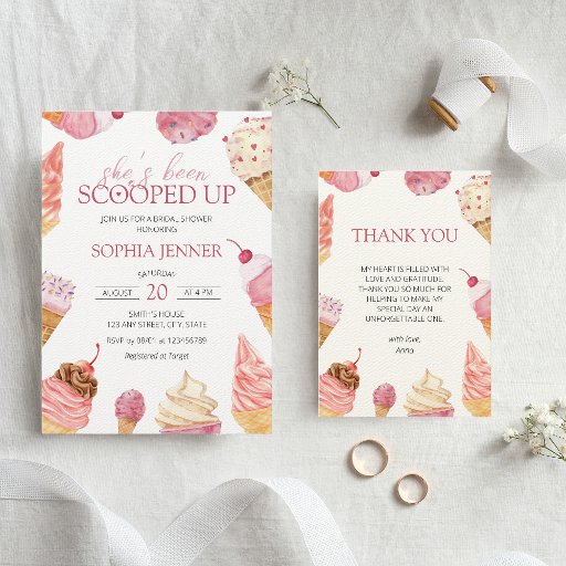 Matched to the sweet aesthetic of "She's Been Scooped Up," the game cards feature adorable ice cream illustrations, watercolor pinks, and playful pastels. The design seamlessly integrates with the overall theme, creating a cohesive and charming atmosphere for the bridal shower.
