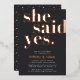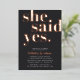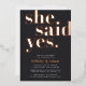 Modern and minimalist engagement party invitations feature chic black and white styling with "she said yes" in oversized rose gold foil retro lettering. Personalise with your engagement celebration details beneath. Invitations reverse to a pattern of colourful stars.