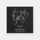 This elegant black and white script "She said yes" engagement party napkin can be personalised with all your names and special date. Designed by Thisisnotme©