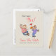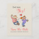 Informal funny Save The Date announcement postcard, where a blushing girl just said yes to the happy boy's big question. All the texts can be edited.