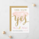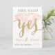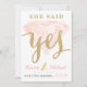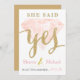 5x7 semi-gloss front, matte back invitation. The front has a pink diamond with gold sparkle letters that says, "She said Yes".