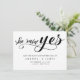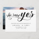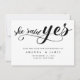 Modern minimalist black she said yes script save the date card. This elegant card features of handwritten script in black colour with cute red heart above ''she said yes'' text on white background and wedding details and names written in capital lettering in black colour.Add website and photo to the back of the card. To edit this template click customise further.