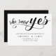 Modern minimalist black she said yes script save the date card. This elegant card features of handwritten script in black colour with cute red heart above ''she said yes'' text on white background and wedding details and names written in capital lettering in black colour.Add website address to the back of the card. To edit this template click customise further.