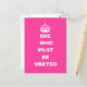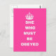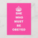 Funny women's parody of the vintage keep calm slogan with she who must be obeyed on a bright girly pink background colour and white royal princess crown or tiara. Visit the CUSTOMIZEDGIFTS STORE for matching products and more keep calm inspired typography designs