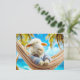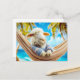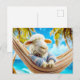 A woolly sheep peacefully napping in a hammock under tropical palm trees, with a dreamy blue sky above. A humourous and playful illustration that mixes holiday vibes with the fluffy calmness of a sheep.