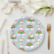 Paper dish with sheep illustration in the starry sky with rainbow and clouds.