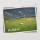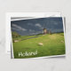 Photo postcard of some sheep in the green grass in front of three windmills under a dark sky with rain clouds just before a spring storm in a landscape in Leidschendam, the Netherlands with a white edge and the text 'Holland'. The image is a bit rotated to create the illusion of it laying loose.