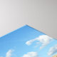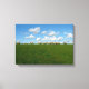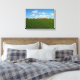 Sheeps in a row walking on a green grass and blue sky in the background wrapped canvas print.
