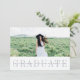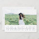 Modern graduation photo announcement features your favourite landscape orientated or horizontal photo on the front, with "graduate" displayed beneath in elegant grey-blue lettering. Personalise with your name, school and graduation year on a sheer white stripe overlay. Cards reverse to a subtle ikat pattern in dove grey and white. An elegant and modern choice for 2023 graduates.