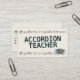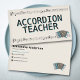 A business card with an illustration of a blue piano accordion and sheets of music. Perfect for accordionist, lessons, teacher, musician performer, concert, etc.