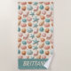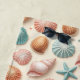 Sea shells and sea stars in blue and tan, against a light sandy background creates the perfect beach towel! Perfect for a day spent at the beach.