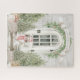 This fun Christmas themed puzzle features a sheltie sitting on the porch wearing a Santa hat and a red scarf. The porch is decorated for Christmas with lighted Christmas trees. Text in a banner reads "Happy Howl-idays." You can change this text if you prefer.