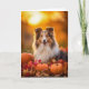 Embrace the rustic charm of Thanksgiving with our stunning card showcasing an adorable Shetland Sheepdog in a harvest field as the sun sets in the background. Share the warmth and beauty of the holiday with your loved ones through this exquisite card.